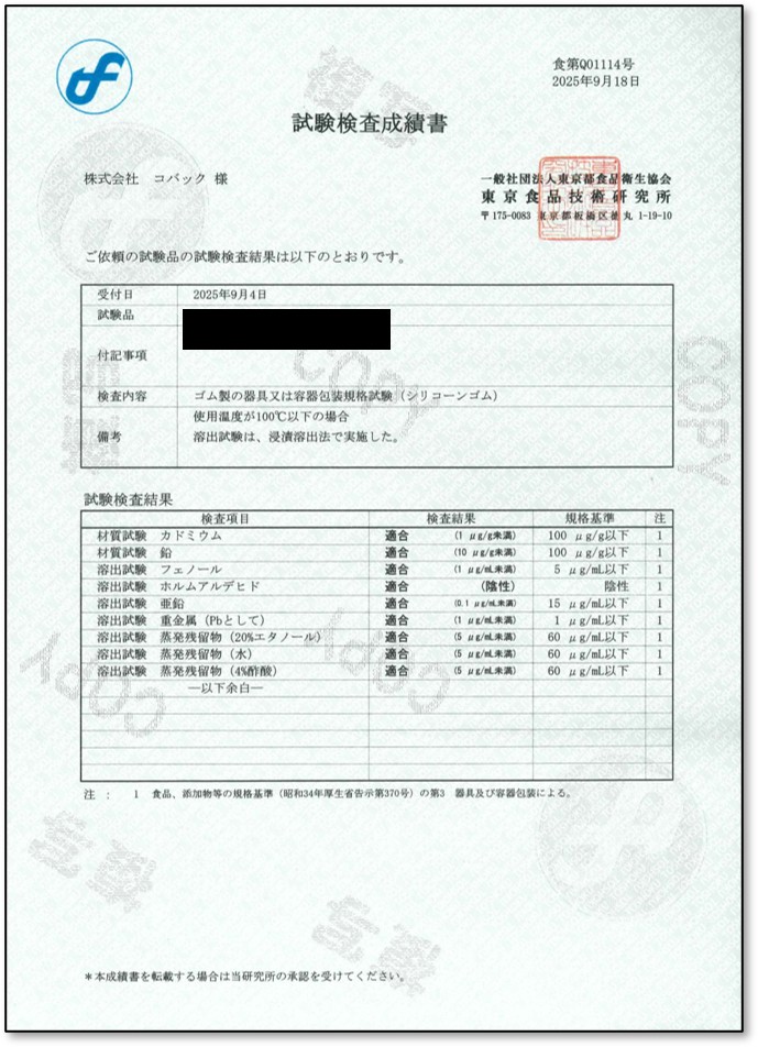 - シリコーンゴムはポジティブリストの対象外ではありますが、食品衛生法への適合を確認、証明するためには、材質試験(鉛やカドミウムの含有量)や溶出試験(ホルムアルデヒドや亜鉛などの溶出量)を行う必要があります。外部の分析機関にて、分析を行うことが可能です。※分析費用が掛かります